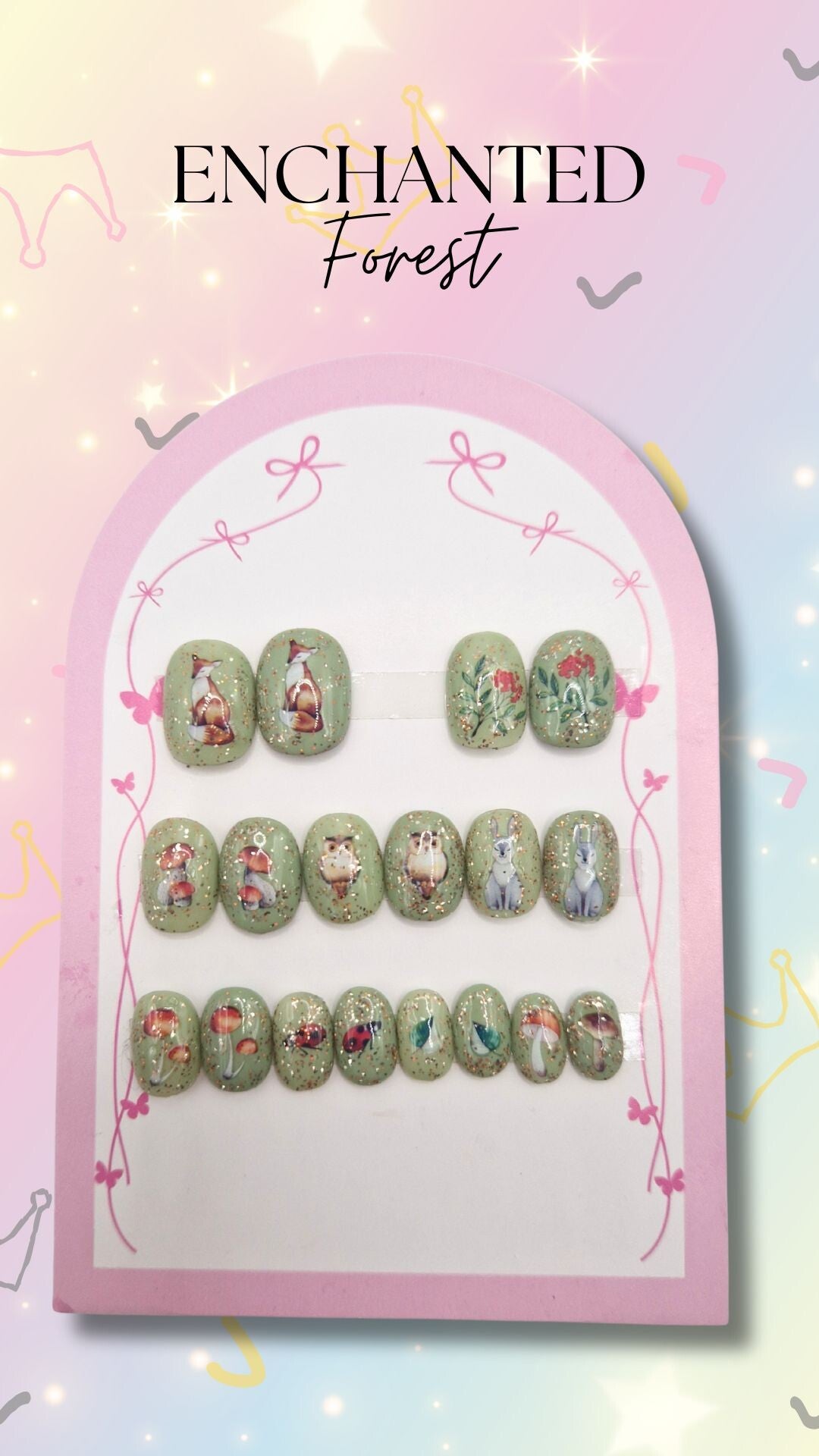 Each Fairytale Set includes 18 press-on nails (2 of each size) — perfect for the tiniest royals.